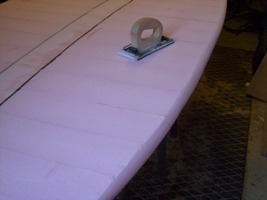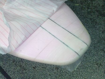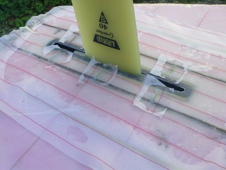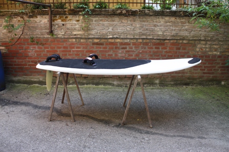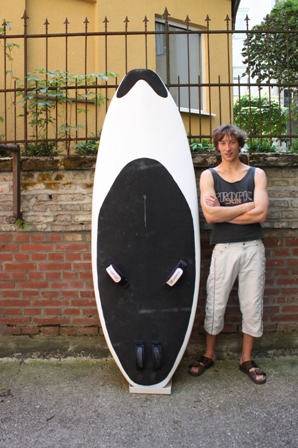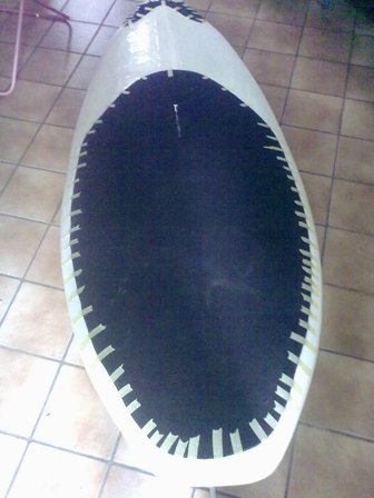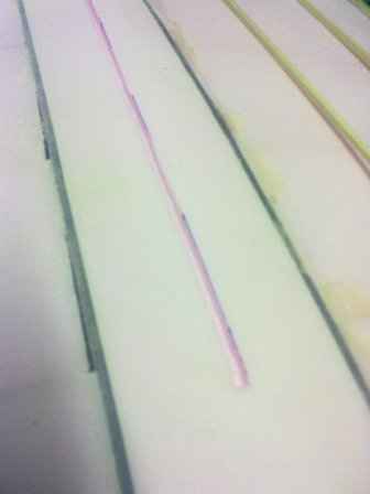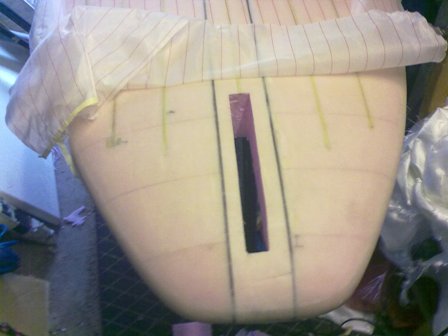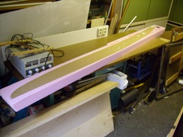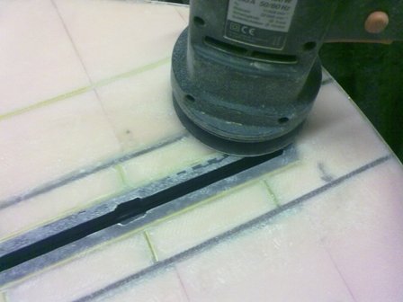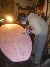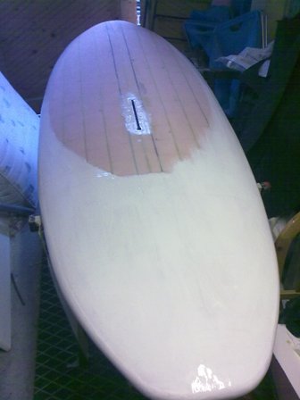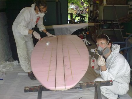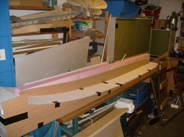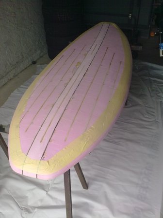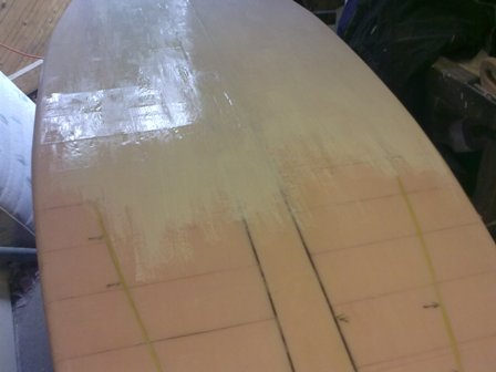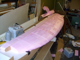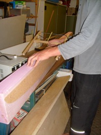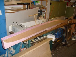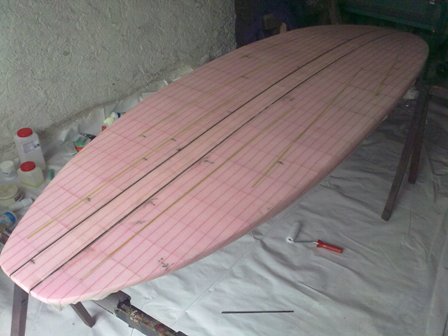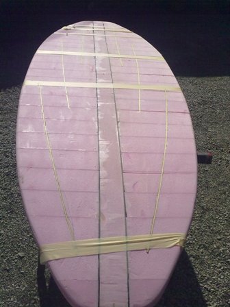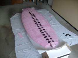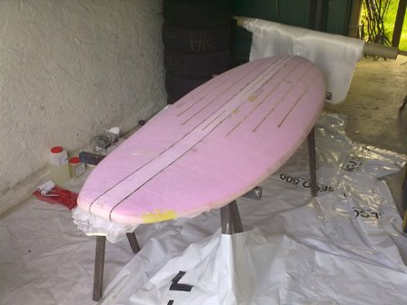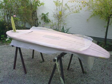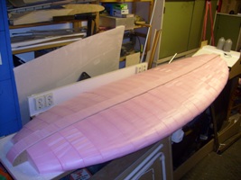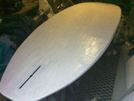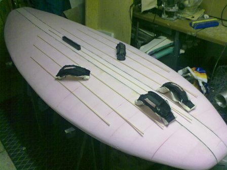 Im April 2007 waren dann die Zeichnungen in Catia V5 soweit abgeschlossen, dass es an den eigentlichen Bau gehen konnte. Der Aufbau des Bretts ist allgemein aus 10cm breiten Streifen ausgeführt. Diese wurden mit Hilfe von Holzschablonen und Heißdraht geformt und verklebt. Nach einigen Stunden Schleifarbeit wurde dann der Blank mit 3 Lagen 160g/m²-Glasgewebe geschlossen und erhielt noch Verstärkungen im Trittbereich und an der Boardnase. Für die Mast- und Finnenschiene wurde gemäß der Anleitung der Fa. Bacuplast eine Verkastung erstellt und mit Ober- und Unterlaminat verklebt. Abschließend erhielt das Brett noch eine Lackierung mit UV-resistentem Bootslack und eine großflächige Moosgummibeschichtung.
