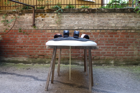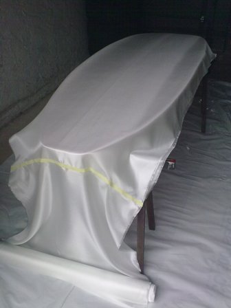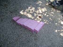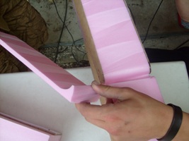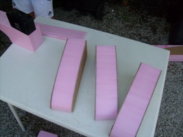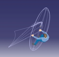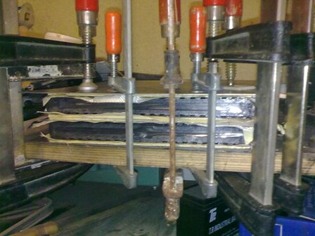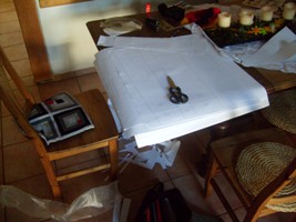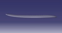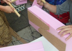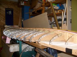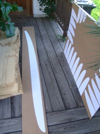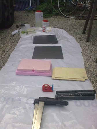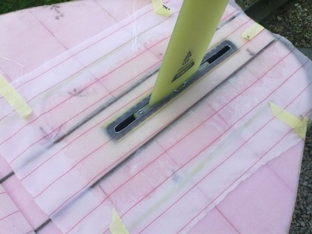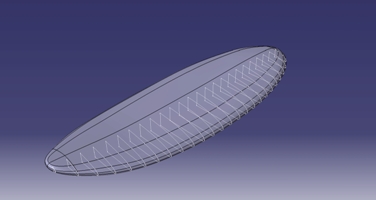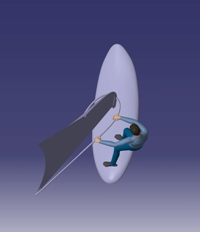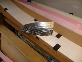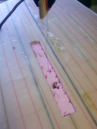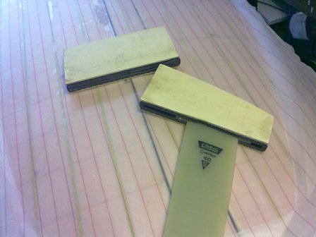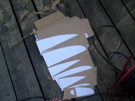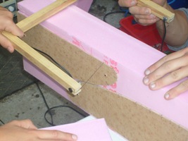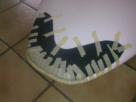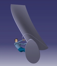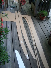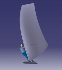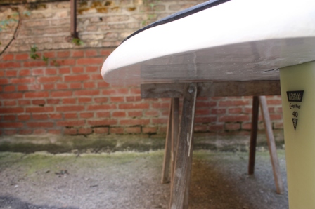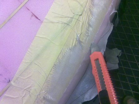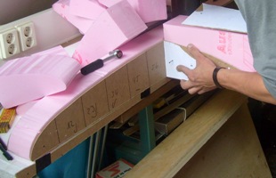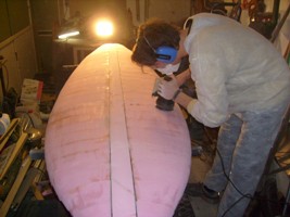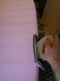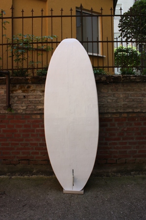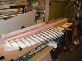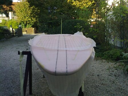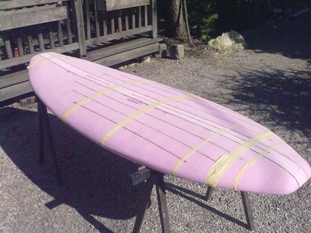 Im April 2007 waren dann die Zeichnungen in Catia V5 soweit abgeschlossen, dass es an den eigentlichen Bau gehen konnte. Der Aufbau des Bretts ist allgemein aus 10cm breiten Streifen ausgeführt. Diese wurden mit Hilfe von Holzschablonen und Heißdraht geformt und verklebt. Nach einigen Stunden Schleifarbeit wurde dann der Blank mit 3 Lagen 160g/m²-Glasgewebe geschlossen und erhielt noch Verstärkungen im Trittbereich und an der Boardnase. Für die Mast- und Finnenschiene wurde gemäß der Anleitung der Fa. Bacuplast eine Verkastung erstellt und mit Ober- und Unterlaminat verklebt. Abschließend erhielt das Brett noch eine Lackierung mit UV-resistentem Bootslack und eine großflächige Moosgummibeschichtung.