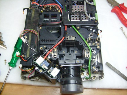 Bei der ersten Funktionskontrolle war zu beobachten, dass die Status-LED der Lampe rot blinkte und damit auf einen Fehler der Birne hinwies. Da aufgrund der geringen Betriebsstunden ein Defekt der Birne auszuschließen war, wurde das nähere Umfeld der Glühbirne untersucht. Nach einer ersten Sichtkontrolle vermutete ich einen Sicherheitsschalter für die Öffnungsklappe der Birne als Fehler, was sich aber als Irrtum herausstellte. Im weiteren Verlauf der Kontrollen zeigten die Steckkontakte der Glühbirne eine erhöhte Korrsion, weshalb diese gereinigt wurden. Seitdem läuft der Beamer problemlos.