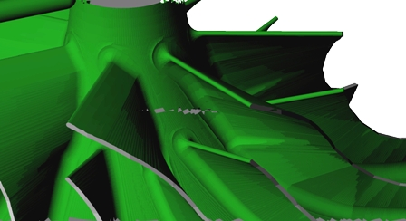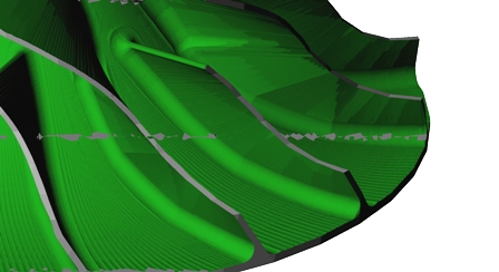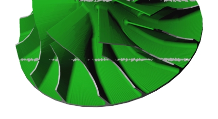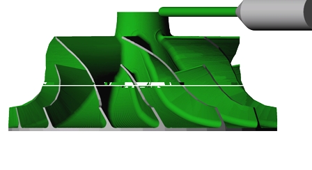 Im dem Softwarepaket Catia V5 sind viele verschiedene Funktionalitäten enthalten. Ein Modul ist die NC Maschinenbearbeitung, mit welcher die Bearbeitung jeglicher Geometrie mit allen möglichen Bearbeitungstypen simuliert werden kann. Dieser Radialverdichter wurde mit 5-Achs-Fräsen erstellt. Dazu wurden die verschiedenen Werkzeuge definiert und die Verfahrwege berechnet. In der Abtragssimulation, wie hier dargestellt, kann das Ergebnis überprüft werden. Abschließend kann in Catia ein allgemeiner NC-Code erstellt werden, welcher mit einem entsprechenden Postprozessor von jeder NC-Maschine gelesen werden kann.