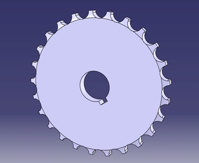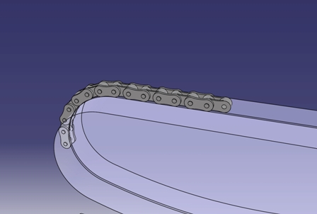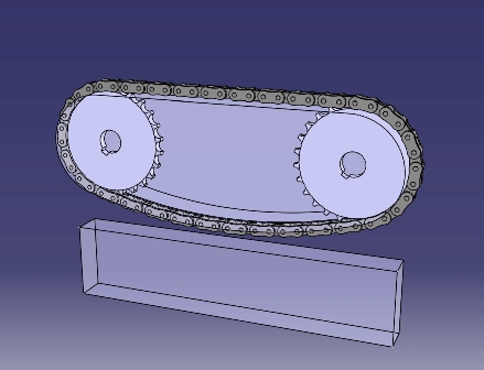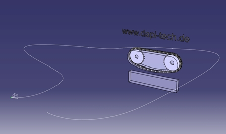 Diese Simulation einer Fahrradkette hab ich erstellt um herauszufinden, inwiefern so etwas mit Catia V5 möglich ist und welche Probleme sich dabei ergeben. Auch wenn das Ergebnis ganz ansehlich ist so musste doch an einigen Stellen getrickst werden. So bewegt sich zum Beispiel die Kette nur immer um zwei Kettenglieder weiter. Dann springt sie zurück und beginnt von Vorne. Dieses Zurückspringen sieht man nicht und so ergibt sich der Eindruck eines fließenden Ablaufs. Ausserdem ist die Simulation sehr anfällig für kleine Änderungen z.B. der Kettenstellung wodurch Kontaktbedingungen schnell ungültig und damit die Simulation unmöglich wird.