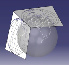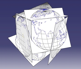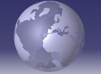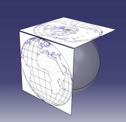 Dieser Globus wurde mit Hilfe von verschiedenen orthogonalen Projektionen erstellt. Die verwendeten Bilder enthielten Informationen über die Perspektive, aus welcher sie die Erde darstellen. Diese Bilder wurden in Catia V5 importiert und auf die richtige Ansicht gelegt. Dann wurden die Kontinente nachgezeichnet und die Zeichnungen dann auf den Globus projeziert.