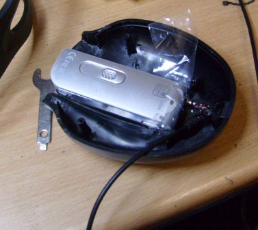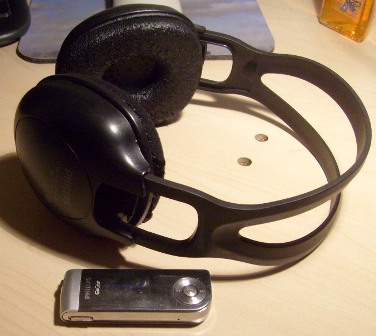 Nach einigen Jahren der Nutzung hatte mein Kopfhörer etliche Brüche in den Stromkabeln, so dass sich die Gelegenheit bot, den sowieso nicht benötigten Kopfhörer zu modifizieren. Aus reinem Zufall bieten die Gehäuse genug Platz für den MP3-Player, so dass dieser dort vewendet werden kann. Aus diesem Grund hab ich das Gehäuse aufgeschnitten, eine Schiene zur Fixierung des Players angebracht und die Steckkontakte im Inneren mit den Lautsprechern verkabelt. Somit kann der Player einfach in das Gehäuse eingeschoben werden und verbindet sich dabei automatisch mit dem Steckkontakt. Der Klang und Tragekomfort der Kopfhörer im Vergleich zu Ohrstöpseln kann sich sehen lassen und mit dieser Modifikation ist man auch mobil unterwegs. |